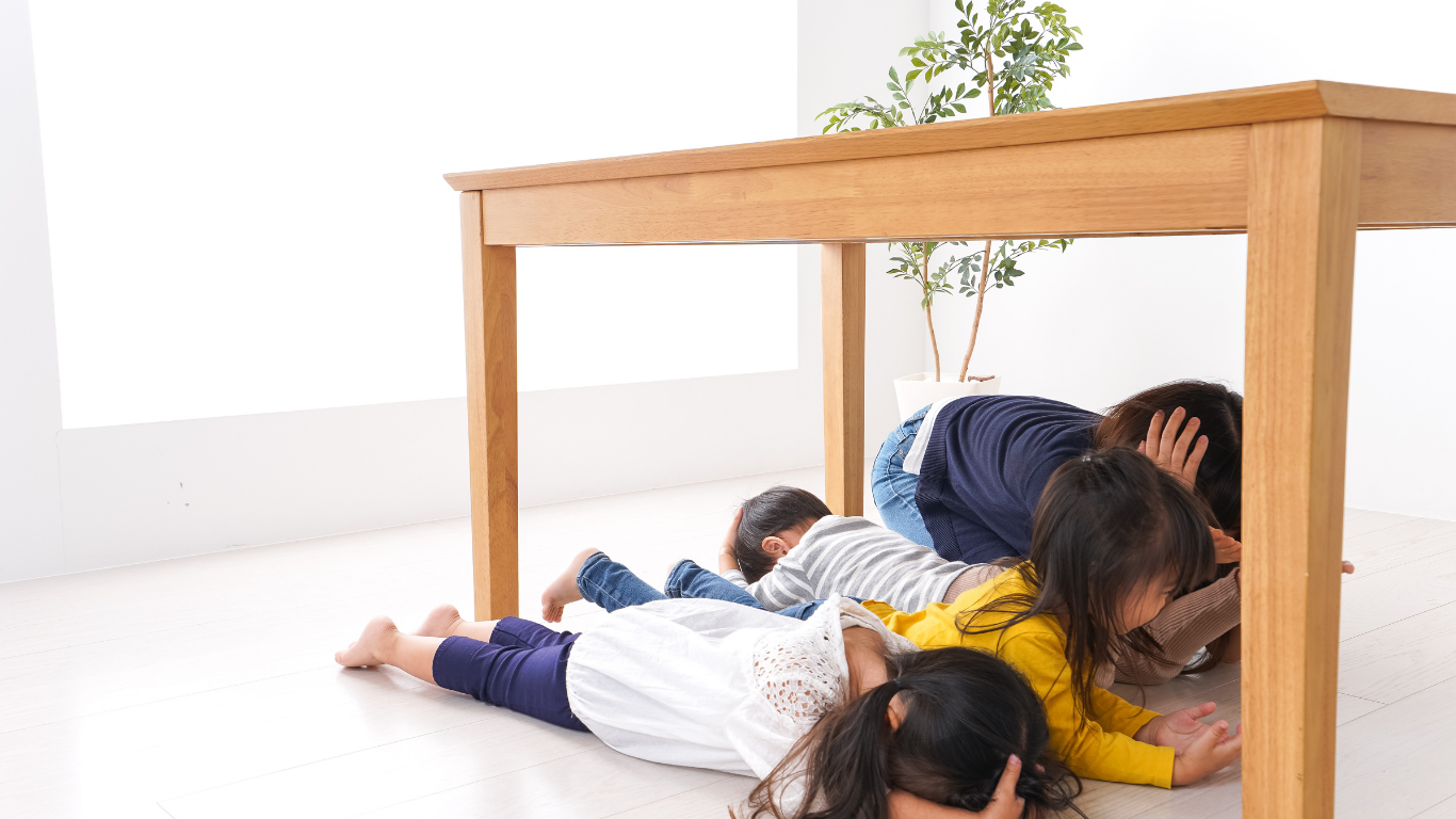 - Colócate bajo los escritorios, mesas fuertes o en los sitios marcados como seguros como son los marcos de puertas y junto a pilares de contención de edificios. Aléjate de ventanas que puedan romperse con el movimiento.