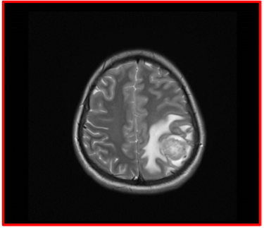 Tomografía de cráneo de paciente con Metástasis de cáncer de mama localizado en región parietal izquierda y que se programó para cirugía y retirar el tumor cerebral.