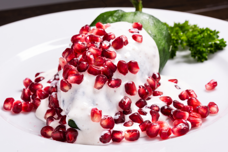 Por último, para presentar correctamente el plato de chiles en nogada estilo Puebla, coloca los chiles en un plato, báñalos parcialmente con la nogada y adorna con el perejil y la granada. ¡Buen provecho!